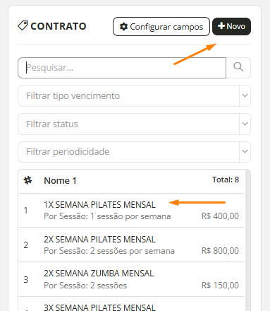 2. Selecione o contrato que deseja configurar como parcelamento fixo ou clique em +Novo para criar um novo contrato.