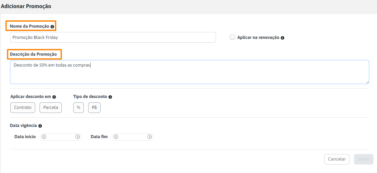 3. Preencha o "Nome" e a "Descrição" da promoção: