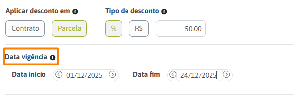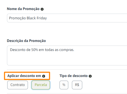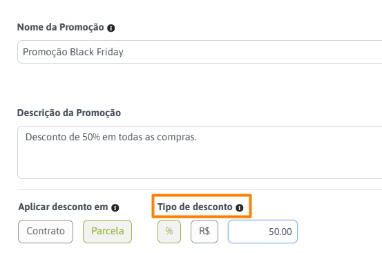 7. Selecione o "Tipo de desconto" e informe o "Valor do desconto":