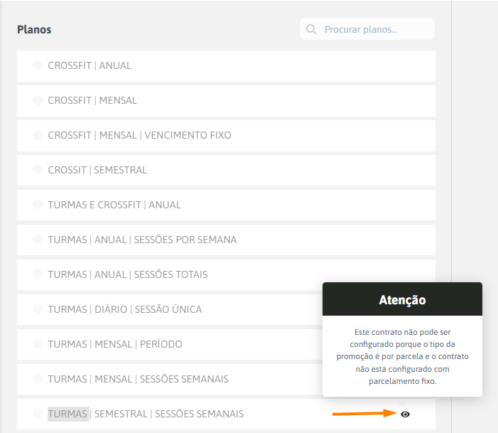 Ps: Caso não seja possível marcar o contrato, ao colocar o mouse em cima do ícone de olho o sistema te mostrará o motivo: