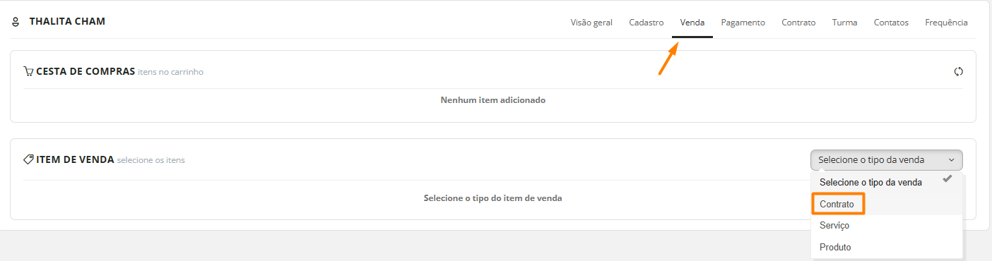 2. Localize o cadastro do aluno, e acesse a aba "Vendas". Selecione então a opção "Contrato" no tipo da venda: