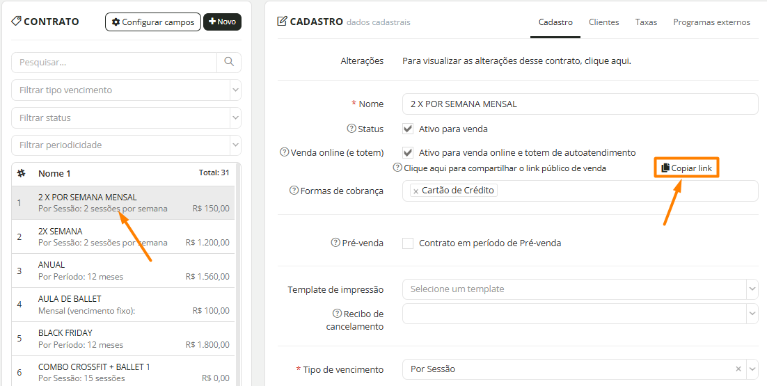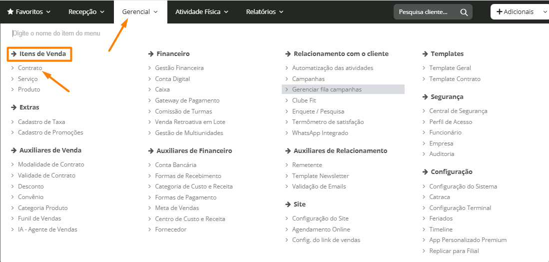 1. Acesse Gerencial > Itens de Venda > Contrato: