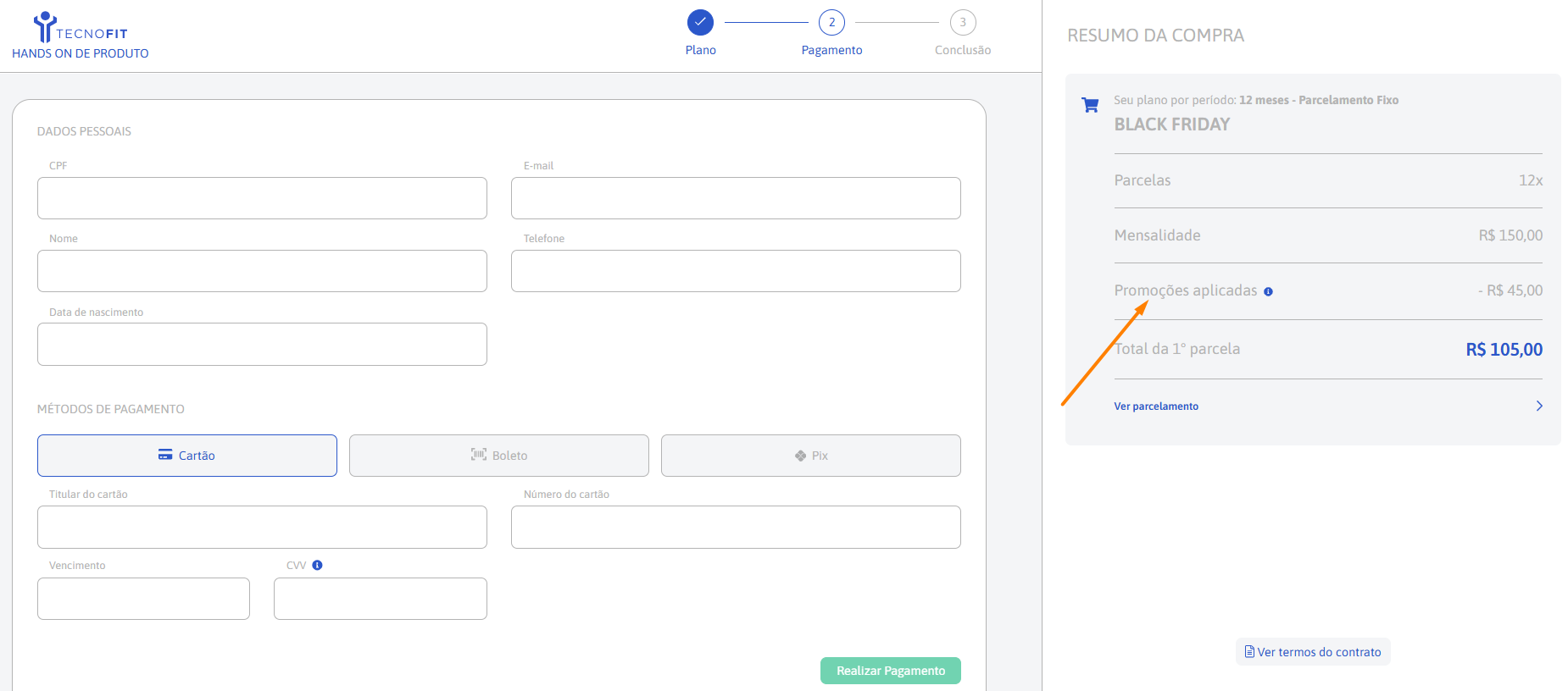 3. Envie para o aluno. Ao abrir o link, o aluno já será direcionado para a página de pagamento, aonde aparecerão as informações referente a promoção: