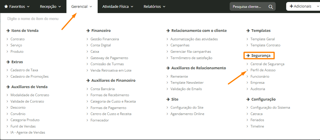 1. No sistema WEB, acesse Gerencial > Segurança > Perfil de Acesso: