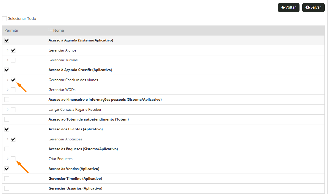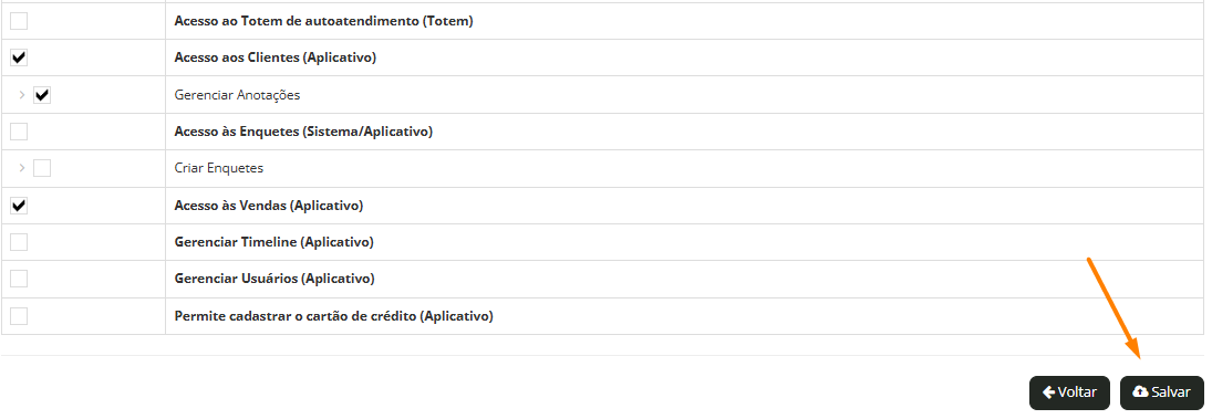 4. Libere ou remova as permissões desejadas para o perfil: