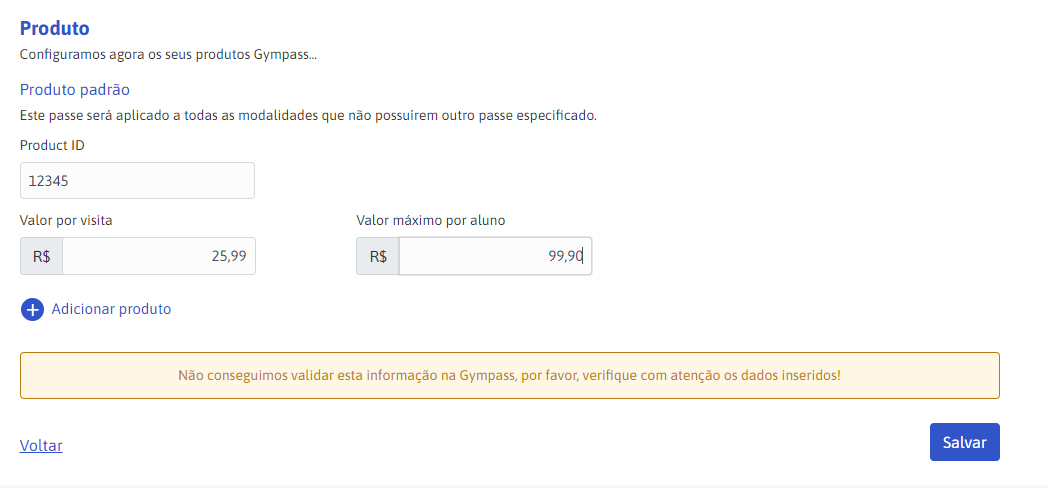 3 - Vincule o Product ID correspondente no campo "Gympass Produto":