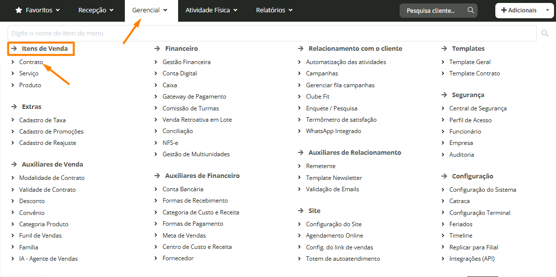 1 - Acesse Gerencial > Itens de Venda > Contrato: