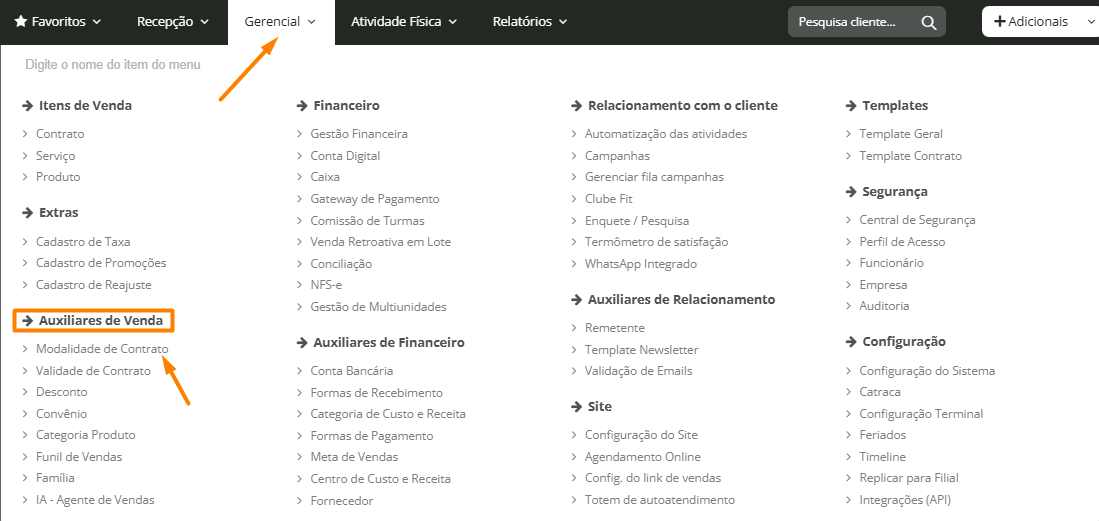 1 - Acesse Gerencial > Auxiliares de Venda > Modalidade de contrato: