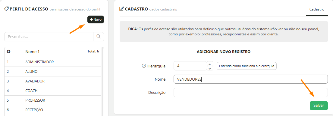 - Clique em + Novo, e no campo "Nome", digite o nome do setor ou da função (ex: Recepção, Professor, Coach, Coordenador...), preencha o nível de hierarquia e clique em "Salvar":