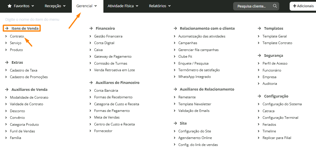 - Após isso, acesse Gerencial > Itens de venda > Contrato, e vincule o template nos contratos: