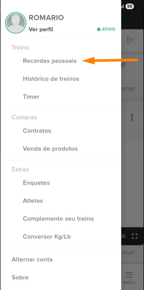 Selecione a opção menu no canto inferior direito do seu aplicativo, em seguida clique em recordes pessoais: