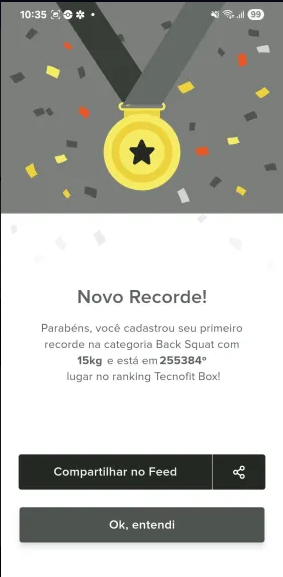 - É possível ainda compartilhar seu resultado no Feed (linha do tempo) da unidade onde treina, ou clicar em Ok, entendi no final para salvar sem compartilhar.