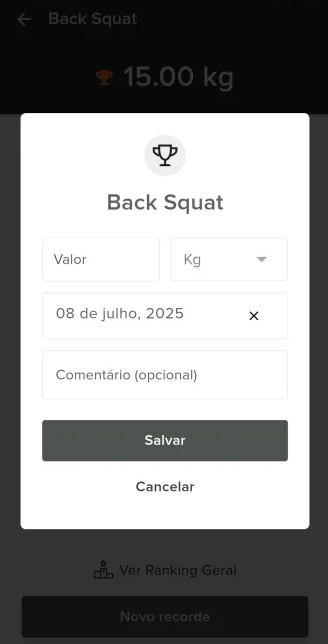 Após a aula realizada, é possível cadastrar o seu Recorde Pessoal (Personal Records) dentro do aplicativo Tecnofit Box: