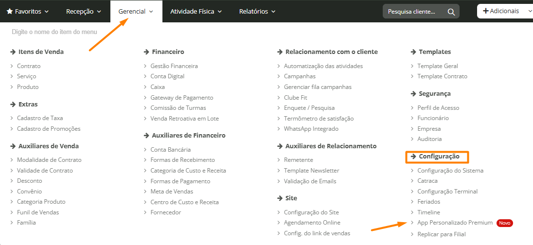 - Acesse Gerencial > Configurações > App Personalizado Premium: