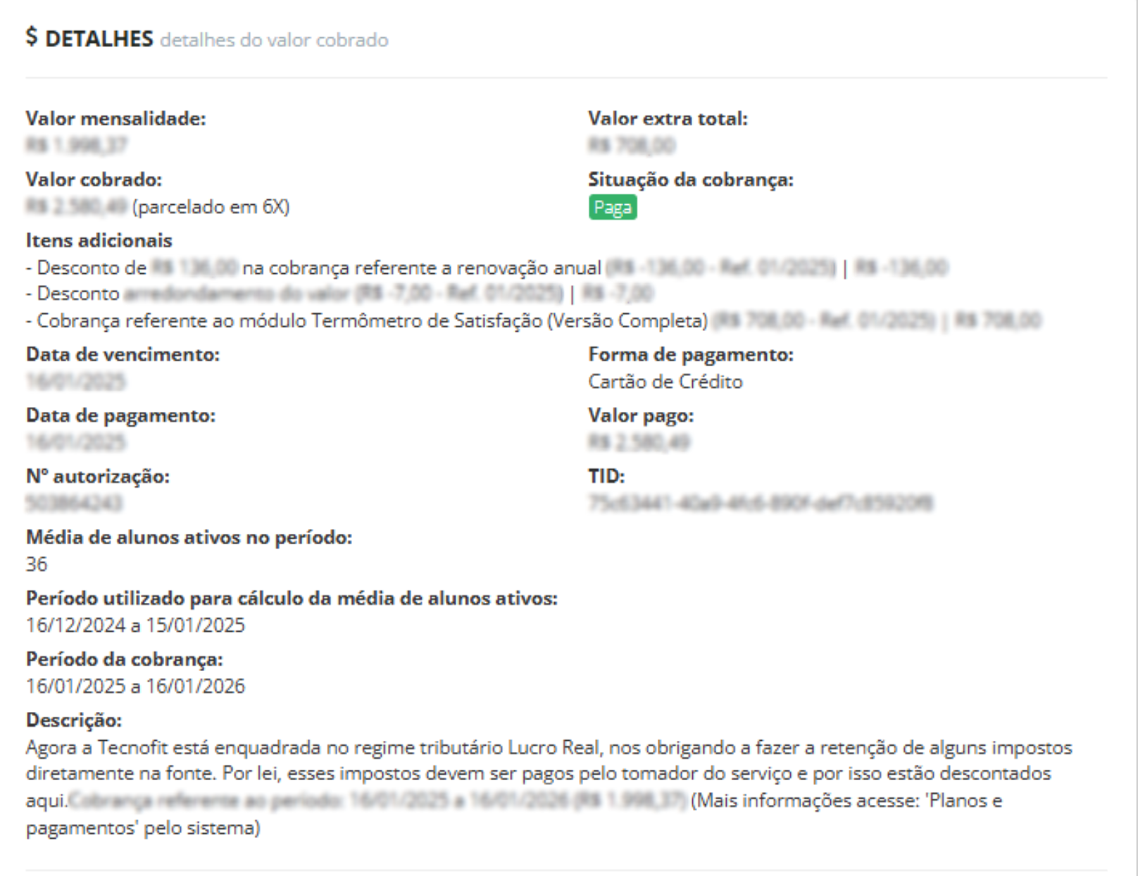 - Será exibido o detalhamento, com período cobrado, itens adicionais, valores, vencimento e demais dados da fatura: