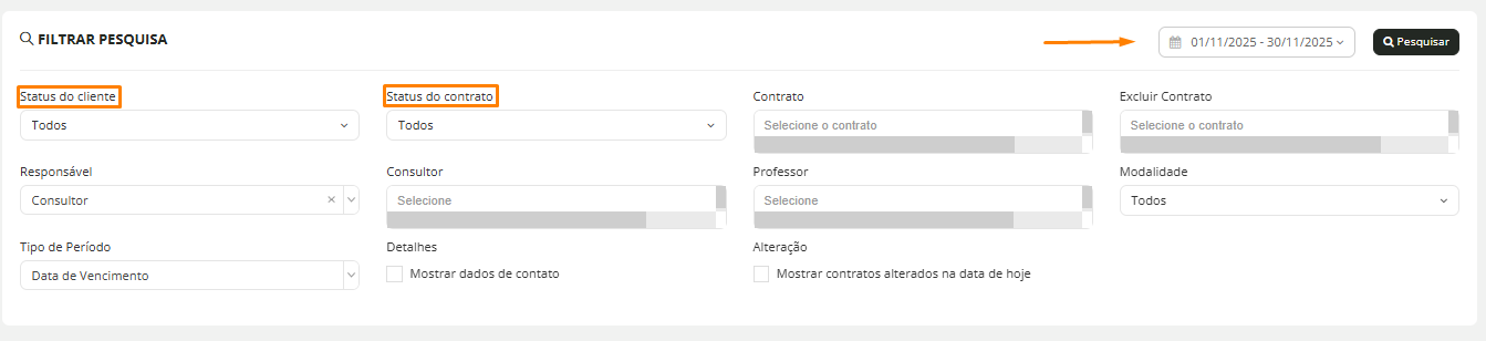 Esses filtros ajudam a visualizar somente os contratos relevantes para seu planejamento.