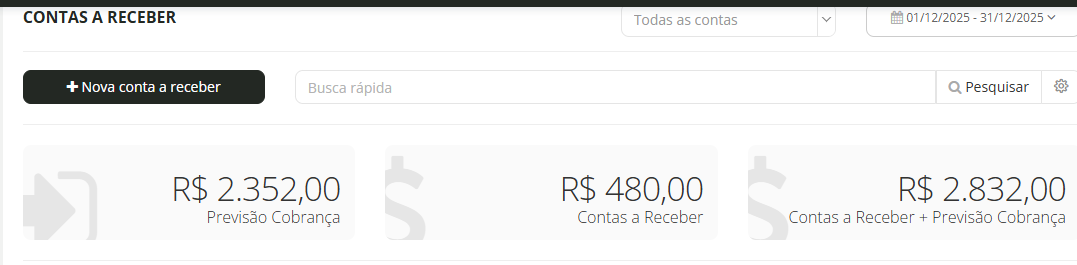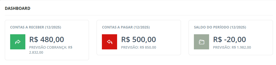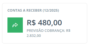 Nesta dashboard, a previsão cobrança (R$ 2.832,00) refere-se a tudo que já está consolidado (R$ 480,00) e tudo que venceu ou está para vencer no período. Ou seja, do previsto de 2.832,00, realizei R$ 480,00: