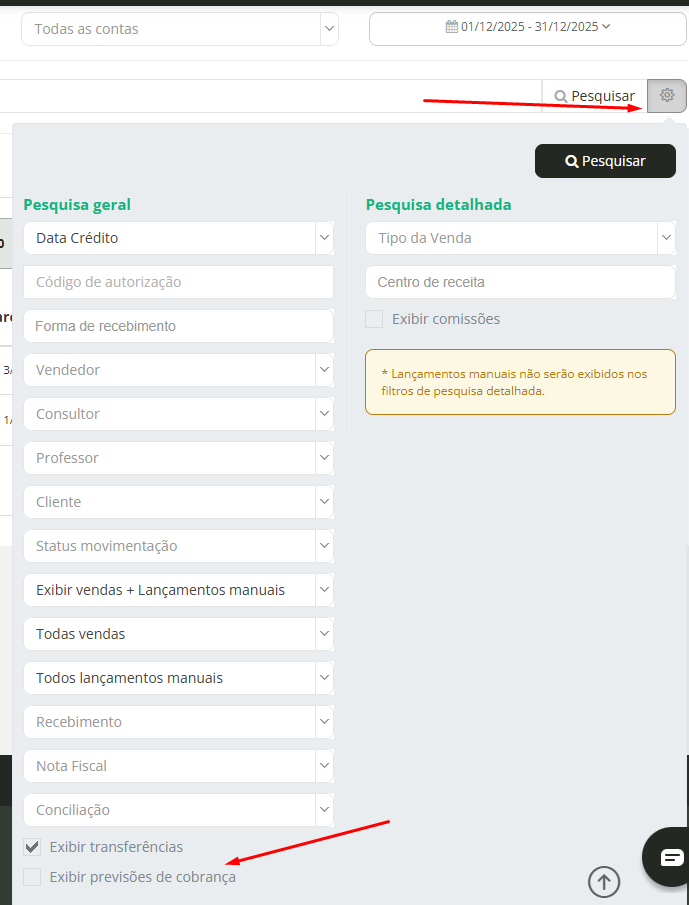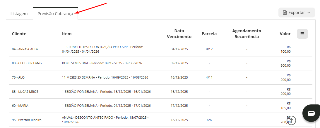 Para saber o que compõe a previsão de R$ 2.352,00, clique na aba previsão cobrança, e você verá tudo aquilo que está em aberto no período: