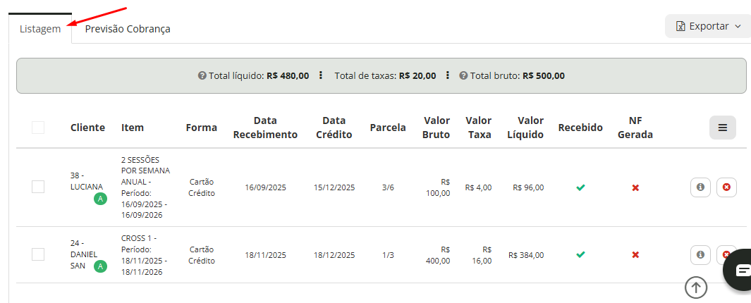 Então, neste caso, os R$ 480,00 refere-se a todos os recibos gerados de pagamentos de alunos, onde a data de crédito, já entrou ou vai entrar no período.