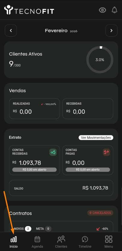 No aplicativo Tecnofit Gestão 2.0, é a primeira tela a aparecer, logo após o login: