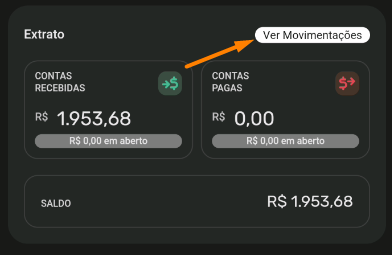 Também é possível incluir novos lançamentos financeiros clicando em "Ver movimentações", no campo extrato, e em "+Novo lançamento":