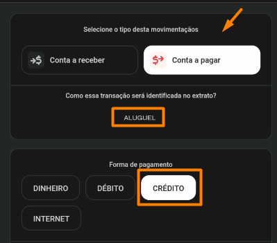 Defina então o tipo de lançamento, o título deste lançamento e em qual forma de pagamento o mês foi/será pago: