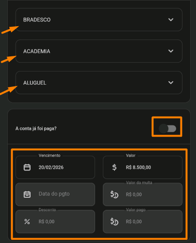 Preencha a conta bancária de onde o valor entrou/saiu, o centro de responsabilidade e a categoria da conta, além das informações referente ao vencimento e valores da conta: