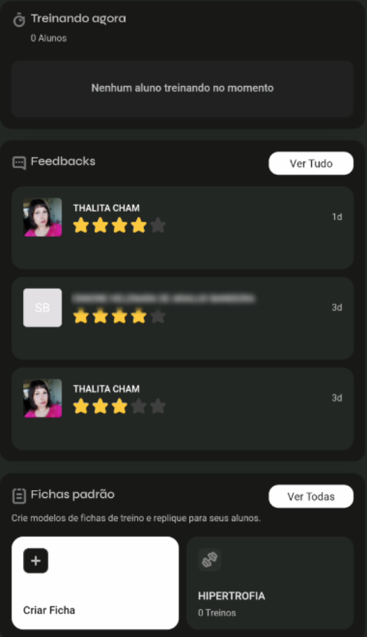 Clicando em "Ver mais", você tem acesso a avaliação dos treinos e também a criação das fichas de treino padrão: