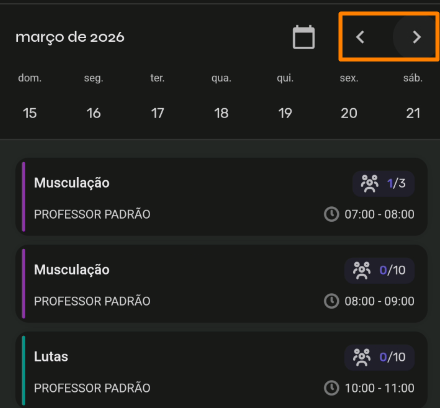 - E para visualizar as semanas seguintes ou passadas, basta utilizadas as setas indicadas: