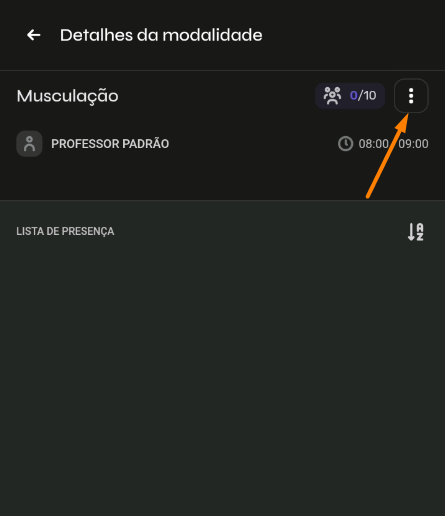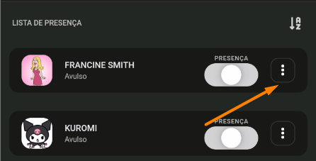 - Para incluir uma evolução no cadastro do aluno, clique na turma em que o aluno possui check-in e após isso, nós 3 pontinhos ao lado do nome do aluno: