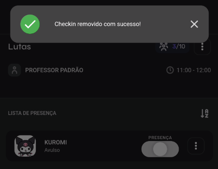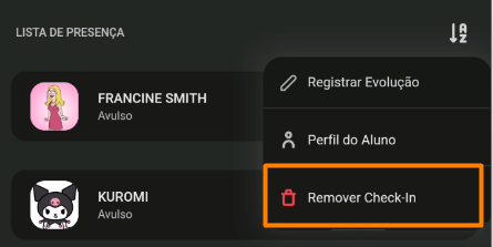 - Para prosseguir com a exclusão de um check-in, basta acessar a turma e clicar nos 3 pontinhos ao lado do nome do aluno, e após isso em "Remover check-in":