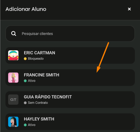 - Clique no nome do aluno para que o mesmo seja incluído na aula: