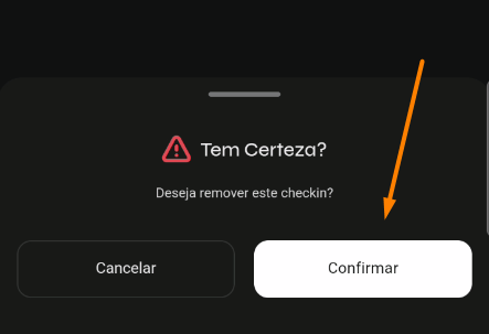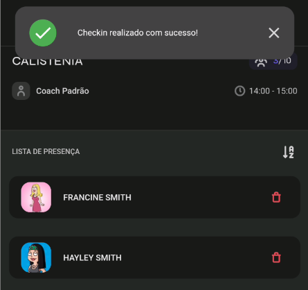 - Para prosseguir com a exclusão de um check-in, basta acessar a aula e clicar no ícone de lixeira ao lado do nome do aluno. Após isso, confirme ao final da página, e o check-in será removido: