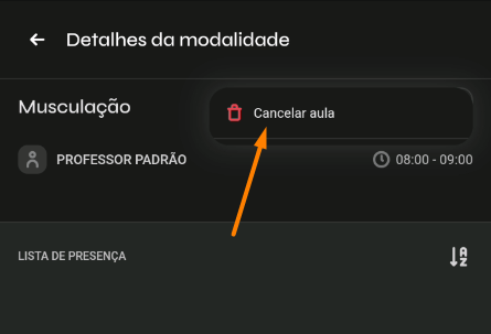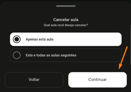 - Clique em "Cancelar aula" e depois defina se apenas a aula do dia será excluída, ou se todas as aulas do horário serão excluídas (a partir do dia em questão), clique em "Continuar".