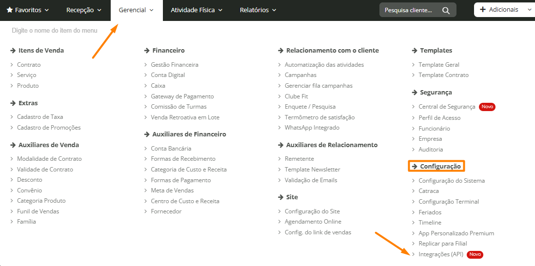 1. Acesse Gerencial > Configurações > Integrações (API):