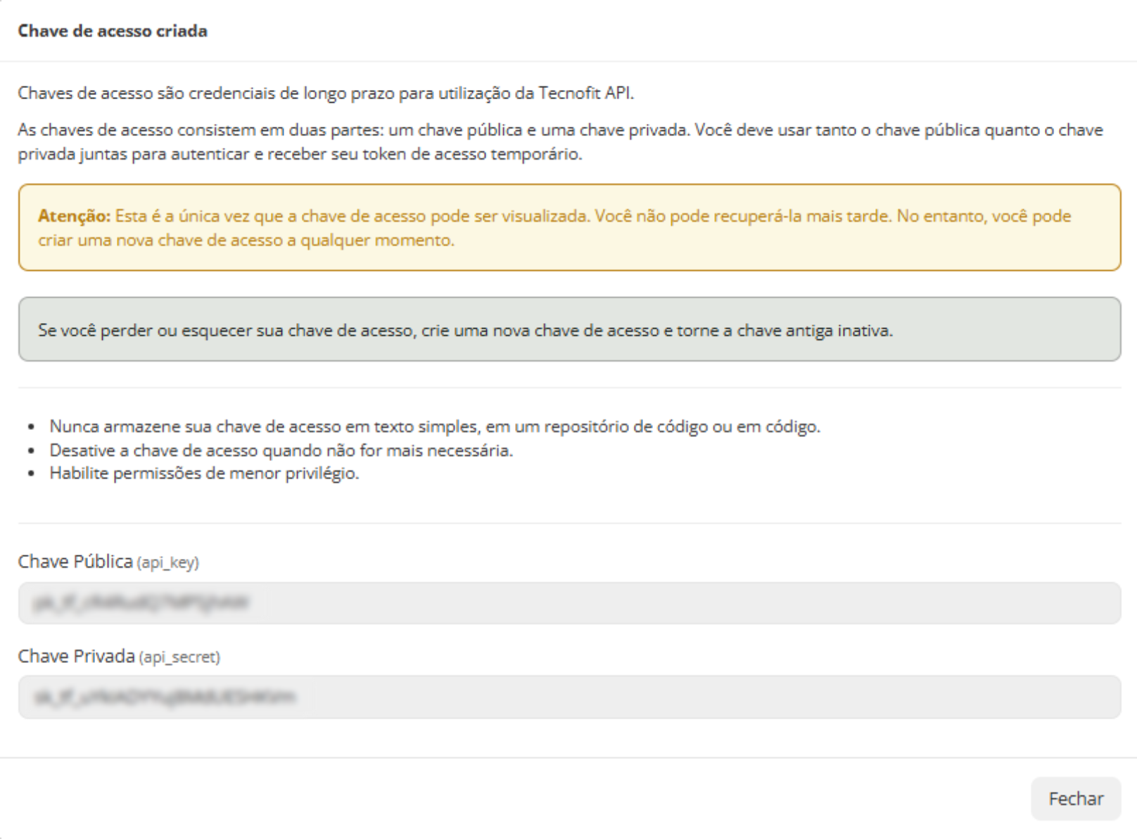 ⚠️ Importante: As chaves são exibidas apenas uma vez no momento da criação. Copie as chaves e cole no sistema de destino.