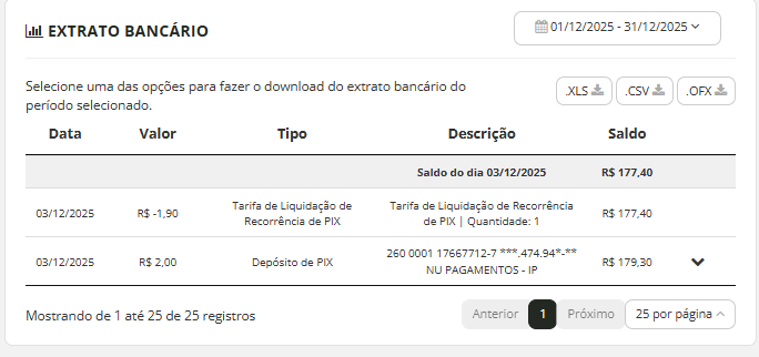 Os detalhes do Extrato Bancário, irá apresentar algumas informações importantes: data de pagamento, valor pago, tipo de pagamento (pix ou boleto), descrição do pagamento e o saldo do extrato (somatória do valor já disponível em conta + entrada do pagamento); como no exemplo: