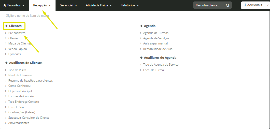 Para acessá-la, clique em Recepção > Clientes > Pré Cadastro: