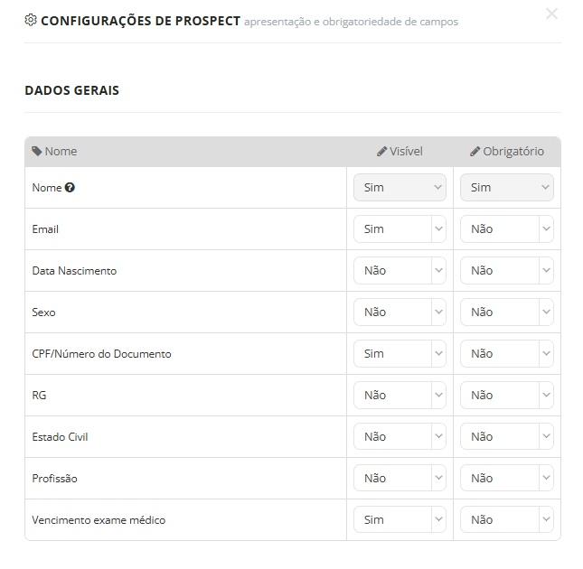 Nesta opção, você define quais campos precisam ser preenchidos obrigatoriamente no momento do cadastro do prospect.