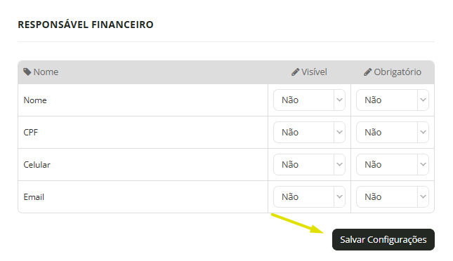 - Obrigatório: Define que o campo estará visível e será obrigatório o preenchimento no cadastro.