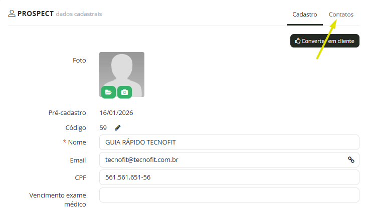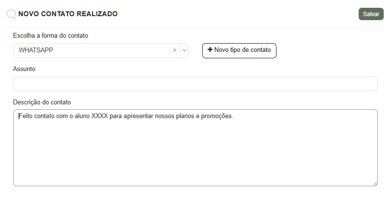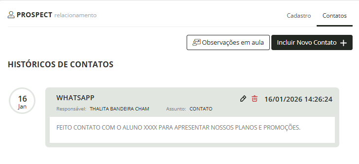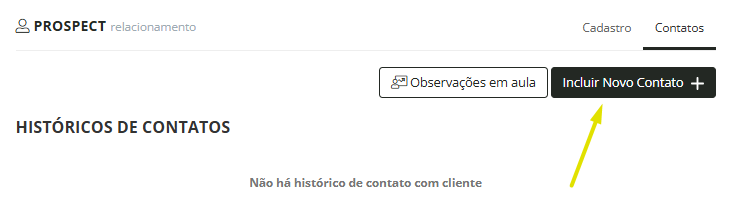 Depois de salvo o cadastro do prospect, a opção "Contatos" aparecerá ao lado do campo cadastro. Nessa tela, você inclui todos os contatos feitos com esse prospect, se aulas experimentais foram marcadas, etc: