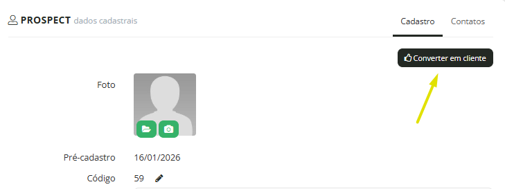 4. Para transformar o prospect em um cliente fidelizado, basta clicar na opção "Converter em cliente" que aparecerá no topo da tela: