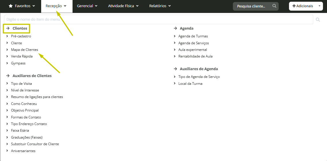 Para acessá-la, clique em Recepção > Clientes > Mapa de Clientes: