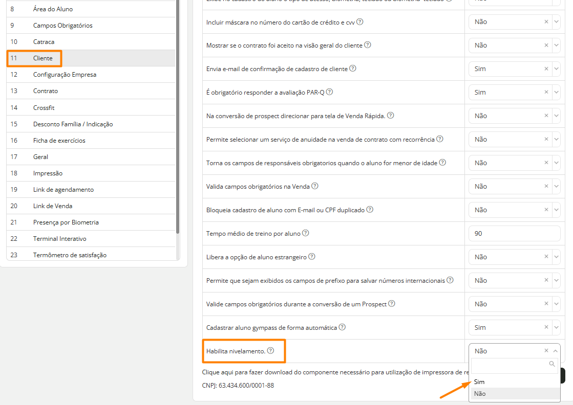 2. Na aba "Clientes", ative a opção "Habilita nivelamento":