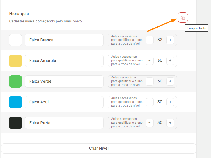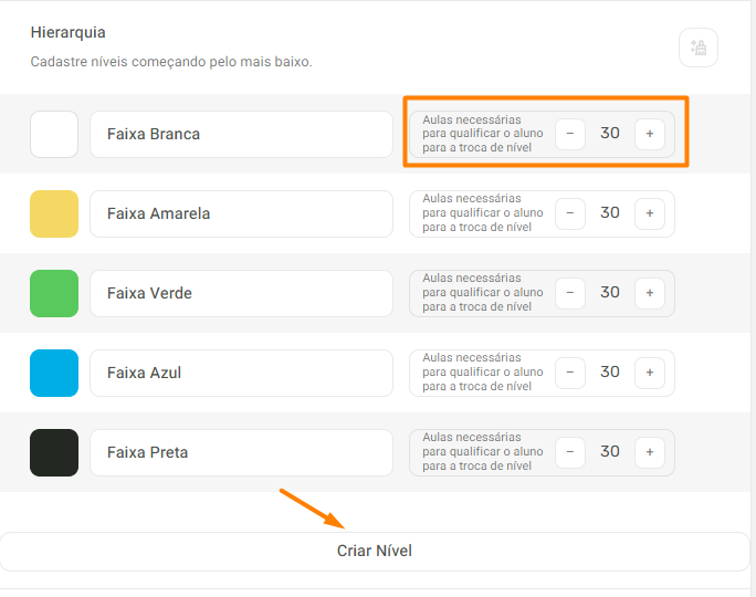 3. Clique em "Criar Nível" para incluir faixas/níveis, ou configure a quantidade de aulas necessárias para a graduação para a próxima faixa: