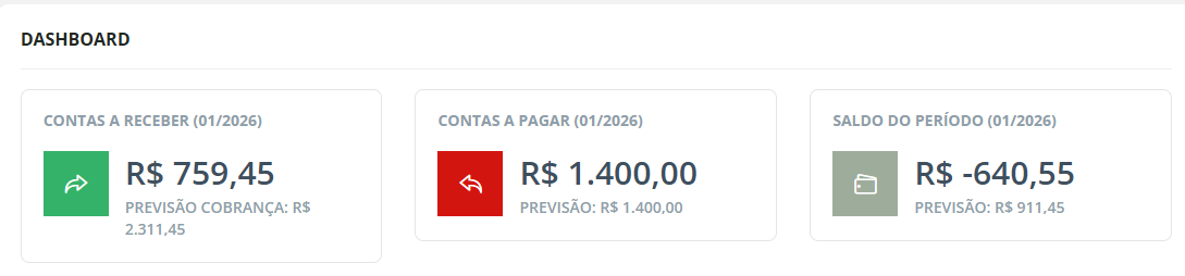 Ao abrir o gestão financeira, encontraremos as dashboards de contas a pagar, contas a receber e o saldo do período em questão. Conforme exemplo abaixo: