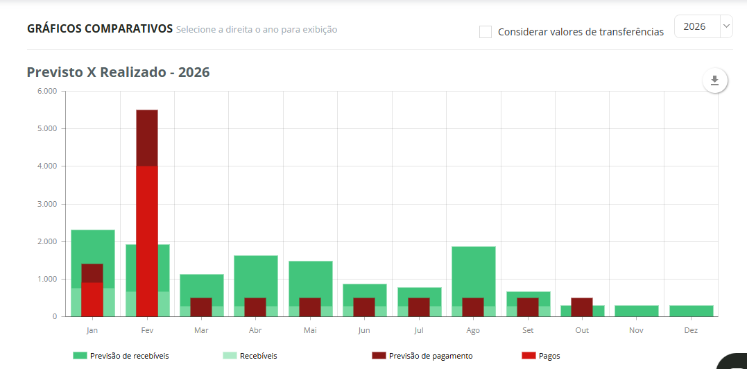 Logo abaixo, temos também o gráfico "Previsto x Realizado", mostrando de forma comparativa as informações de contas a pagar e a receber, podendo assim ter previsibilidade de caixa para meses futuros. E podendo também olhar para meses passados: