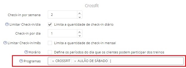 O campo Programas precisa conter os programas que esse plano dá acesso, caso contrário, os horários não aparecerão para o aluno fazer o check-in no aplicativo Tecnofit Box.