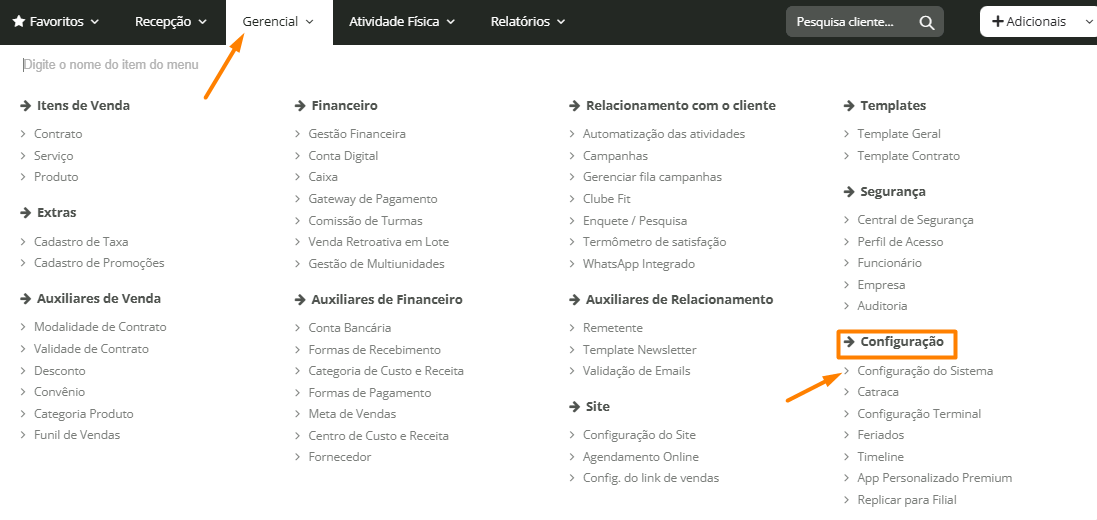 1. Após a confirmação de ativação, acesse Gerencial > Configuração > Configuração do sistema: