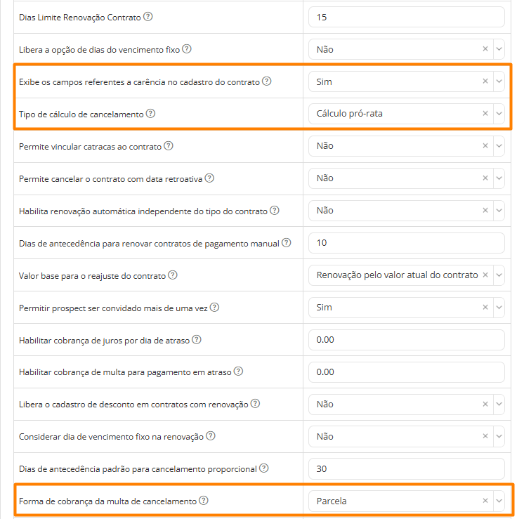 - Tipo de cálculo de cancelamento: Deixe como "Cálculo pró rata" ou como "Ambos";